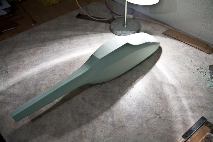 Mehrere Stunden ( oder Tage ? ) Abraspeln und Schleifen mit 80er Leinwand an den richtigen Stelle lassen eine vielflächige Modellform entstehen, an der man die Symmetrie gut überprüfen kann, indem man das ganze ins Licht hält und die Kanten rechts und links vergleicht.